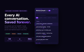 MemoryVault - AI Conversation Saver est une extension pour Chrome qui permet de sauvegarder, rechercher et exporter vos conversations avec des intelligences artificielles comme ChatGPT, Claude, Gemini et Perplexity. Cette application fonctionne sans nécessiter de compte ou de téléchargement dans le cloud, garantissant ainsi la confidentialité des données. Avec une interface simple, il suffit d'un clic pour enregistrer un échange et le retrouver facilement grâce à un index de recherche instantané.